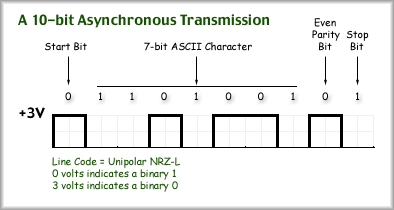 the start bit is a data block such as a 7-bit ASCII character. Following the data is a parity bit and finally a stop bit. The stop bit is usually zero volts.