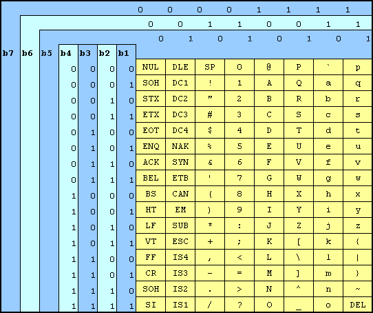 out all 128 unique bit combinations are used. Take a look at this ASCII table. It is used to find the seven binary bits that represent a character (or control character). Each character in a column has the same
