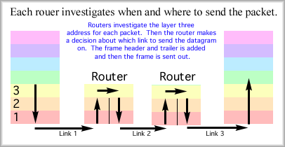 send the datagram and then sends it out on the next link. To do this the packet travels down the OSI stack back through layer two and one. The layer one